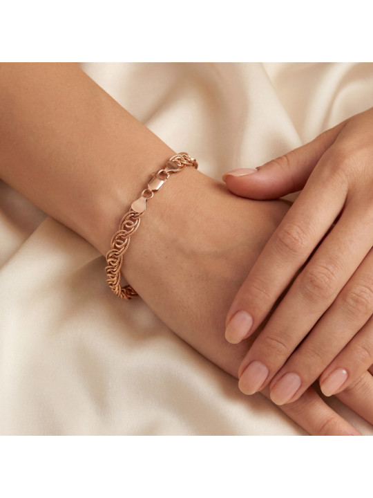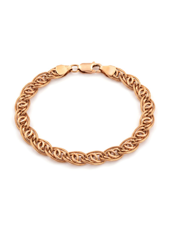 This bold rose gold bracelet stands out with its distinctive link design, combining braided textured elements with interlinked round details for added volume and a refined luxurious finish.
