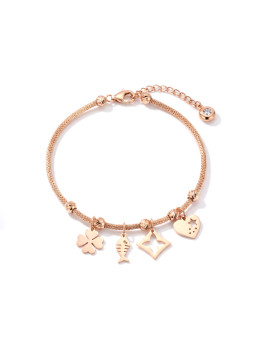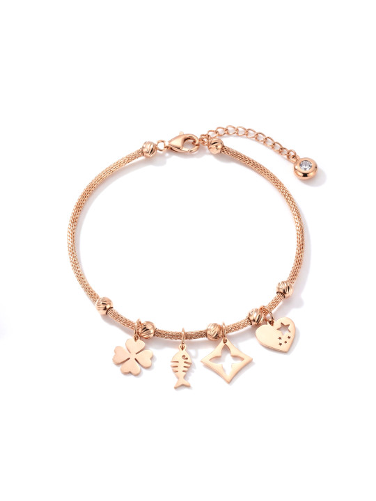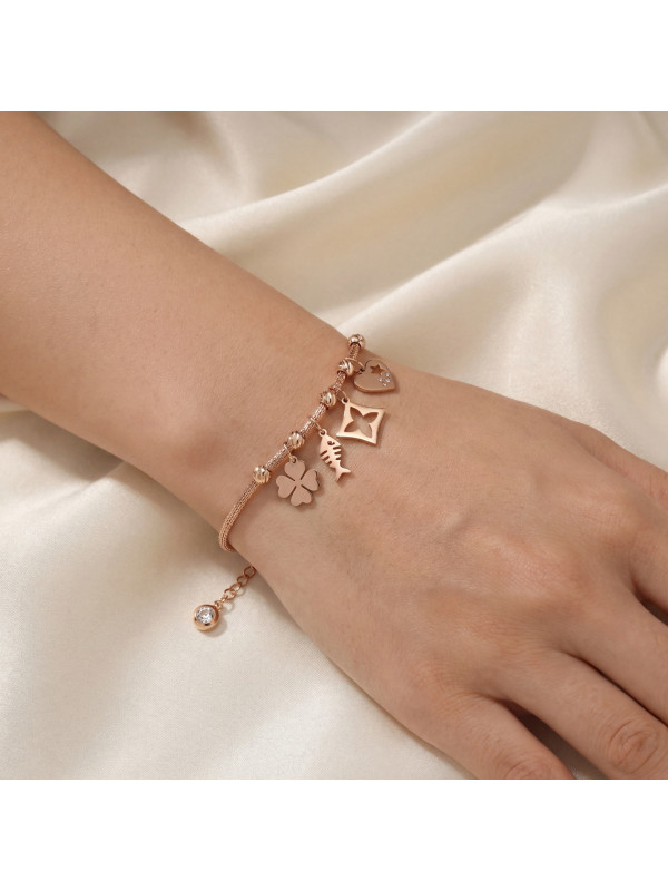 A playful and elegant rose gold bracelet with charm details – clover, fish, geometric symbol and heart. The adjustable extension chain ensures a comfortable fit for everyday wear.