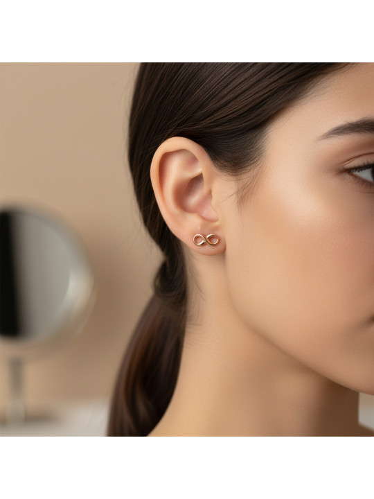 Adorn your ears with these elegantly crafted infinity stud earrings. Made from gleaming rose gold, these minimalist studs offer a touch of timeless sophistication and symbolize eternal love or connection. Perfect for everyday wear or as a thoughtful gift.