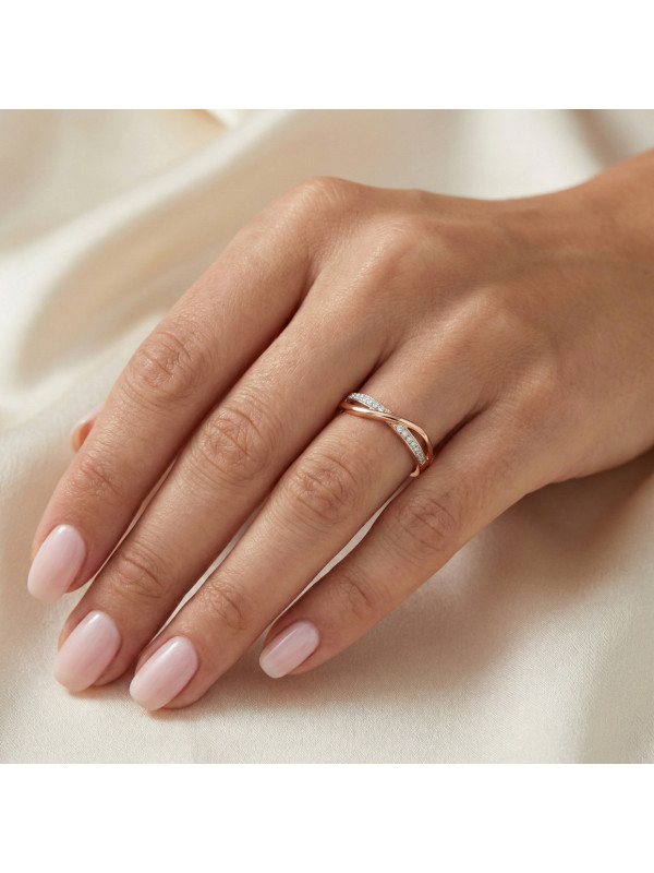 Elegantiškas 585 prabos raudono aukso žiedas su cirkoniais, subtiliai susipinančio dizaino. Tobulas pasirinkimas kasdienai ir ypatingoms progoms.